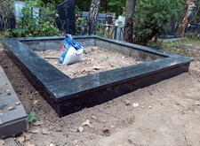 Когда подготовительные работы на территории могилы были завершены, мы принялись за укладку брусчатки на пескобетон, сама плитка была уложена вровень с облицованным гранитными плитами цоколем. Параллельно с этим мы подготовили основание для последующей установки надгробья.